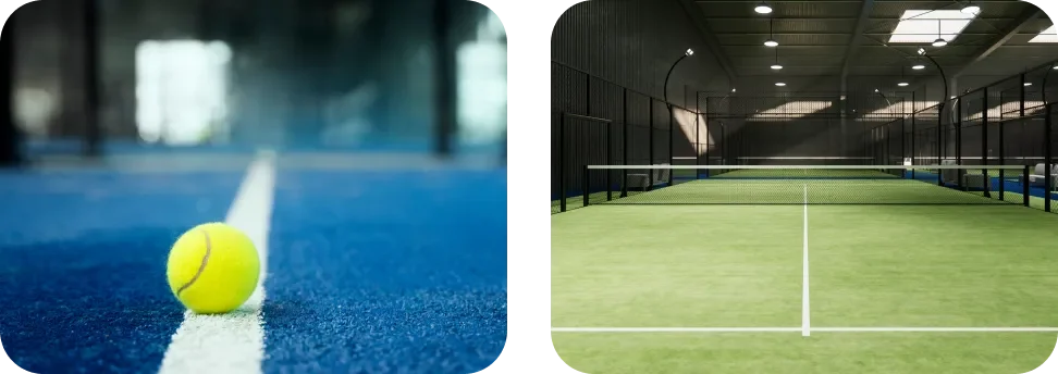 4 padeli- ja 2 tenniseväljakut koos sauna ning lounge-alaga.